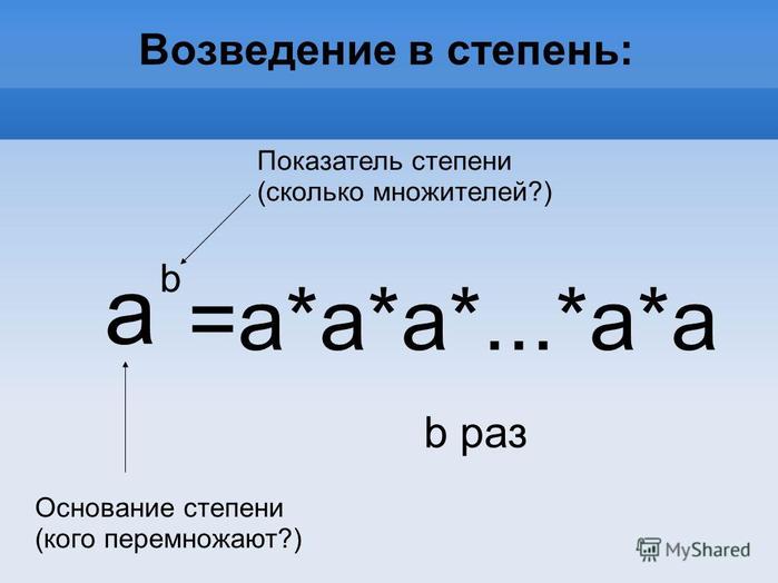 Показатель степени — это маленькое возвышенное число. «Степень» — это все: базовое число, возведенное в некоторый показатель, или значение (ответ), которое вы получите, если вычислите число, возведенное в некоторый показатель. Например, 8 — это степень числа 2, поскольку 2 3 = 8. В этом случае 3 — показатель степени, а 2 3 (все выражение) — степень.