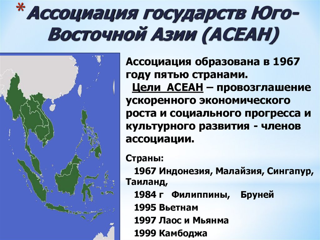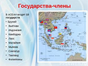 Ассоциация государств Юго-Восточной Азии (АСЕАН) образована 8 августа 1967 г. в Бангкоке. Членами АСЕАН являются 10 стран: Индонезия, Малайзия, Сингапур, Таиланд, Филиппины, Бруней-Даруссалам, Вьетнам, Лаос, Мьянма, Камбоджа.