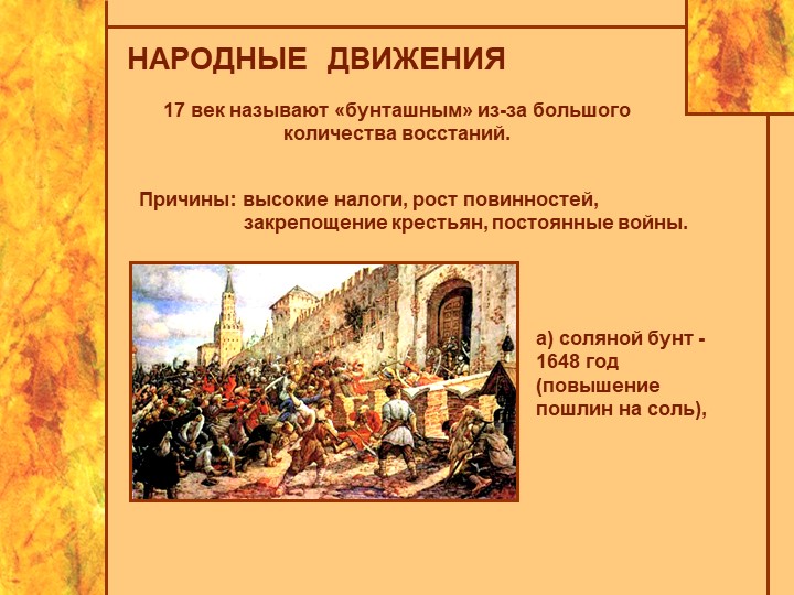 В этот период прошло 6 крупных народных восстаний, не считая мелких выражений недовольств. События начались после завершения «смутного времени». В стране ощущалась нестабильность, вызванная пустой казной. В этих условиях правительство стремилось укрепить власть. Делалось это самым простым способом – ущемлением простого народа.