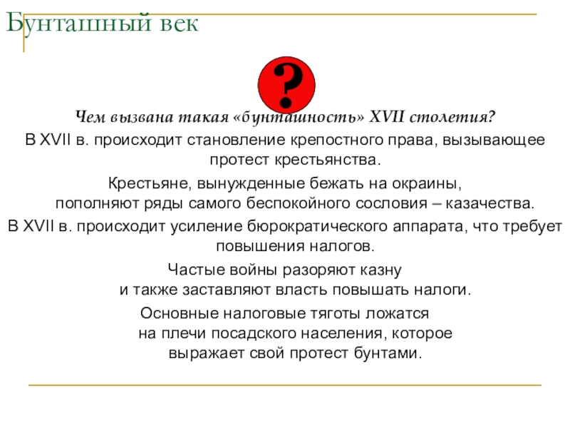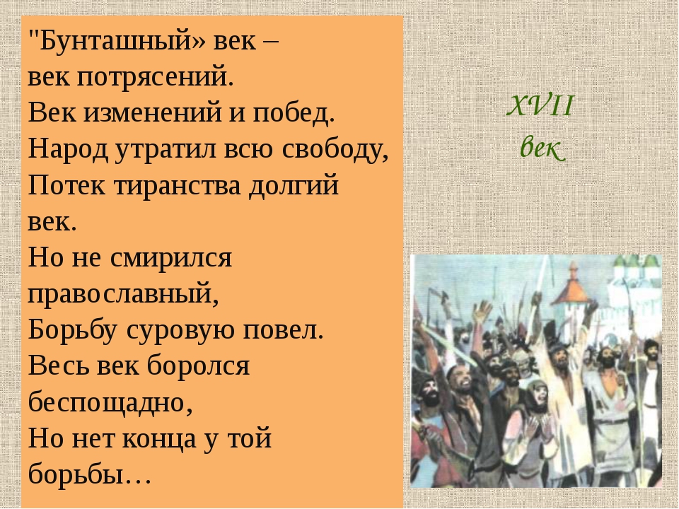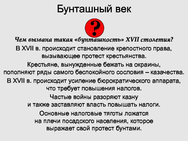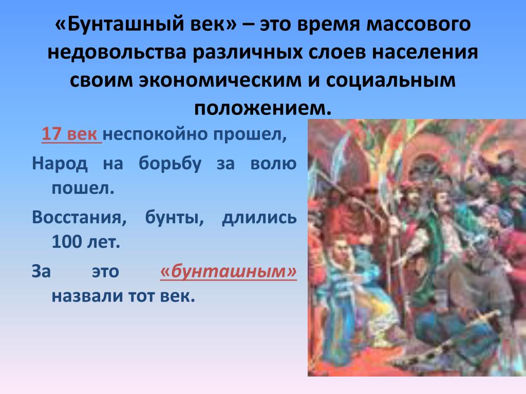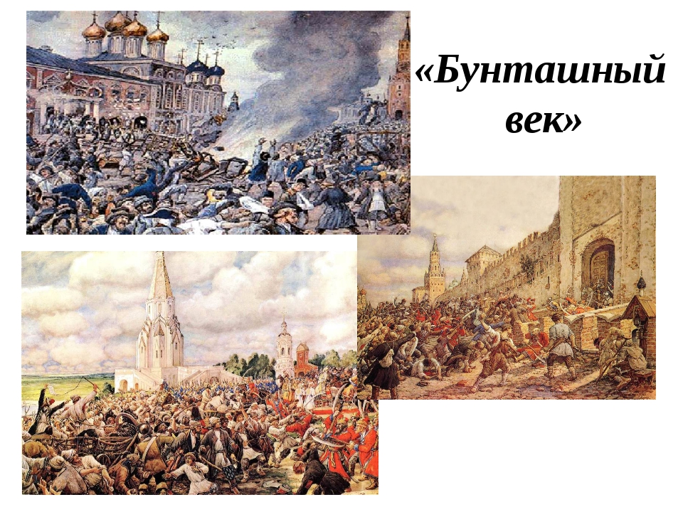 «Бунташный век» относится к XVII столетию. В этот период прошло 6 крупных народных восстаний, не считая мелких выражений недовольств. События начались после завершения «смутного времени». В стране ощущалась нестабильность, вызванная пустой казной. В этих условиях правительство стремилось укрепить власть. Делалось это самым простым способом – ущемлением простого народа.