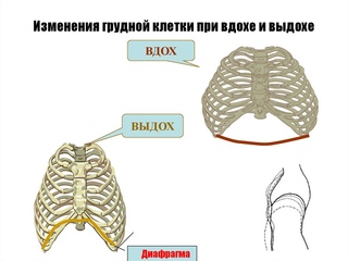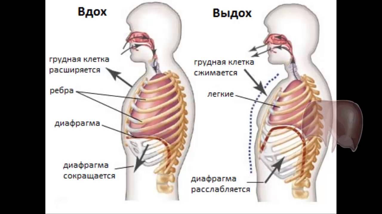 Когда вы вдыхаете, диафрагма движется вниз к животу, а реберные мышцы тянут ребра вверх и наружу.Это увеличивает грудную полость и втягивает воздух через нос или рот в легкие.