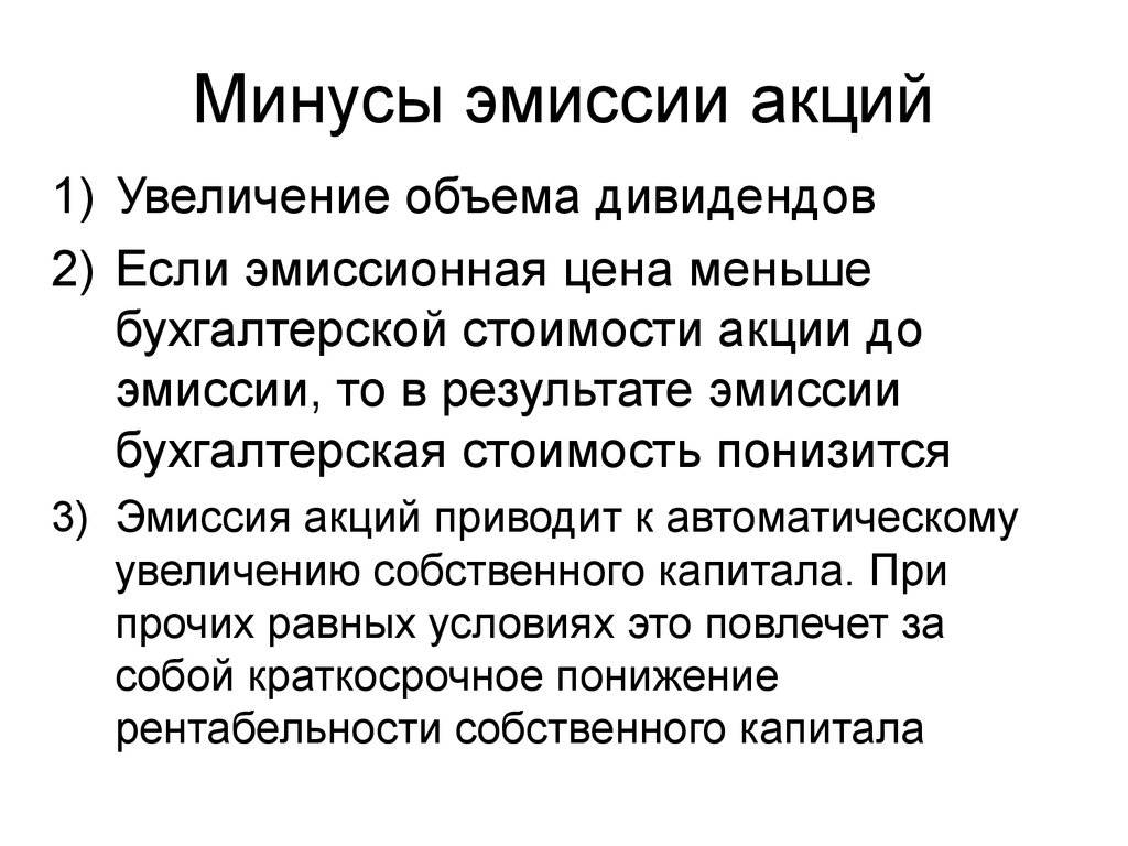 В то же время дополнительная эмиссия влечёт за собой определённые затраты: чтобы выпустить акции на рынок, нужно совершить множество процедур, начиная с оценки активов и заканчивая наймом брокера.. Она также подразумевает репутационные издержки: если компания необоснованно размывает долю акционеров, то будущие инвесторы подумают, стоит ли покупать ценные бумаги компании.
