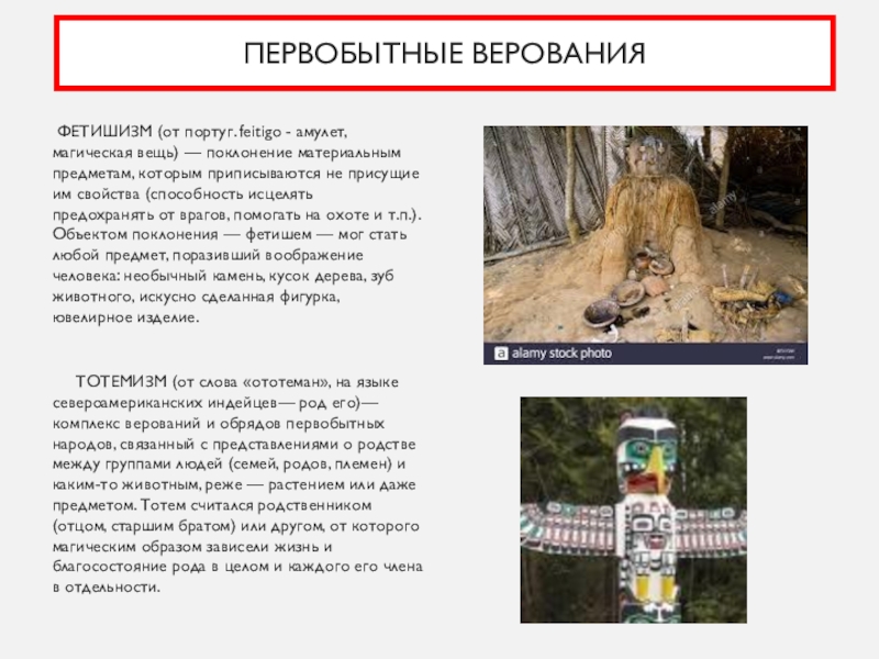 Об одной из форм первобытной религии говорит и понятие «фетишизм», введенное в научную литературу в XVIII в. французским ученым Ш. де Броссом.