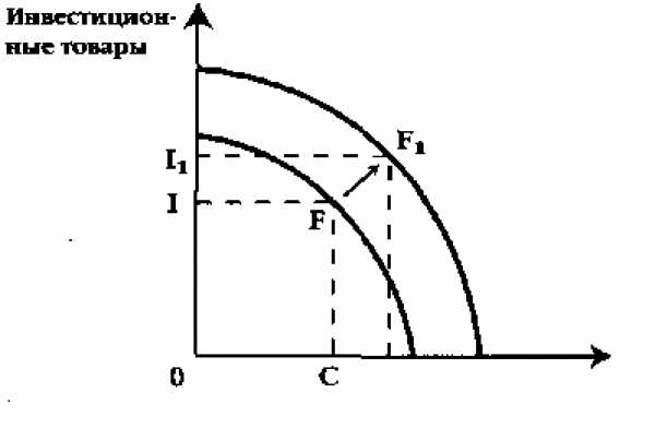 Таким образом, влияние технического прогресса на экономический рост осуществляется через сокращение объема использования количественных факторов и повышение качества относительных факторов экономического роста. Это дает возможность расширить производство одновременно как инвестиционных, так и потребительских товаров путем более эффективного использования ограниченного объема факторов производства, т. е. расширить рамки потенциального ВВП.