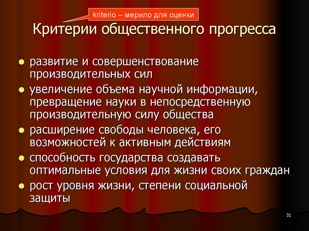 25. «Критерий прогресса» — мера, по которой судят о степени развитости общества.