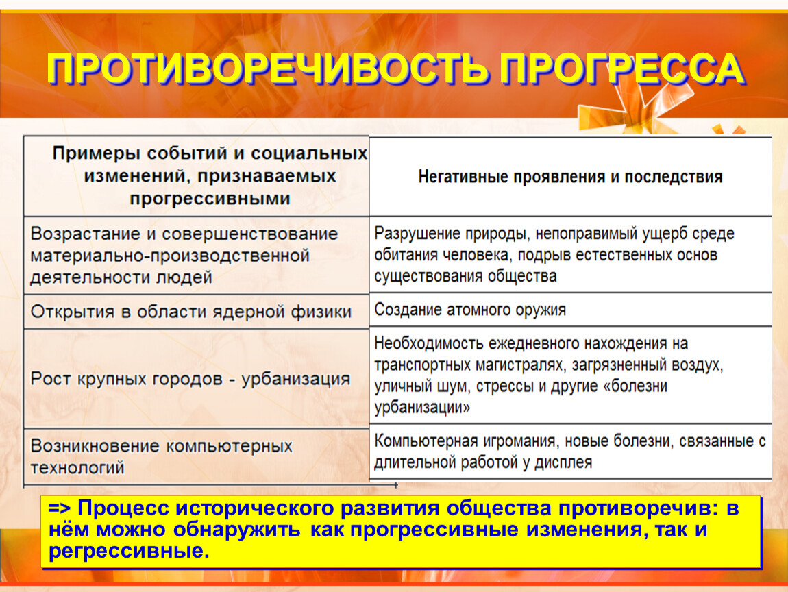 Далее, вспомним, что прогресс и регресс для каждого общества проявляются по-разному, противоречивы. Отвечаем на первый вопрос, сохраняем начало его формулировки (пишем то, что от нас хотят увидеть!):