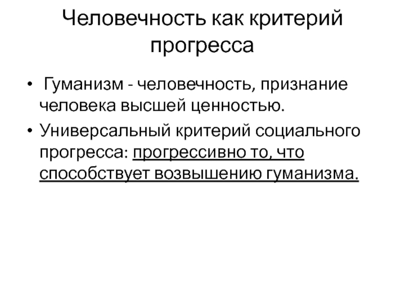 - Универсальным критерием определения прогресса считается степень гуманности общества, возможность предоставить максимальные условия развития каждому человеку.