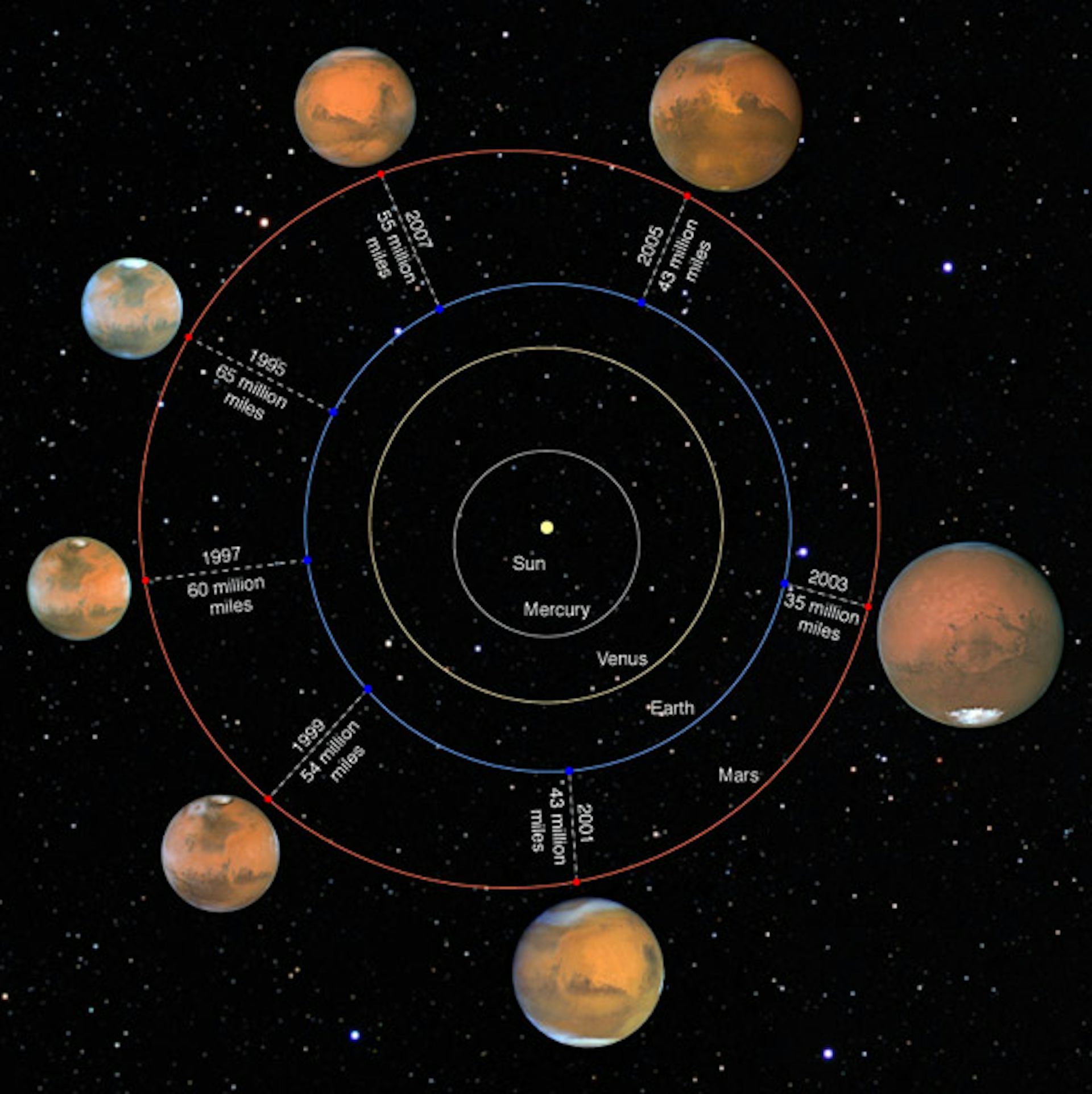 Если бы и Земля и Марс вращались вокруг Солнца по круговым орбитам, находящимся в одной и той же плоскости, расстояние между Землёй и Марсом были бы действительно минимальны точно в моменты противостояний. Но мы не живём в настолько симметричном мире. Все планеты обращаются по эллиптическим орбитам, которые имеют ближайшую к Солнцу точку (перигелий) и самую дальнюю от Солнца точку (афелий).