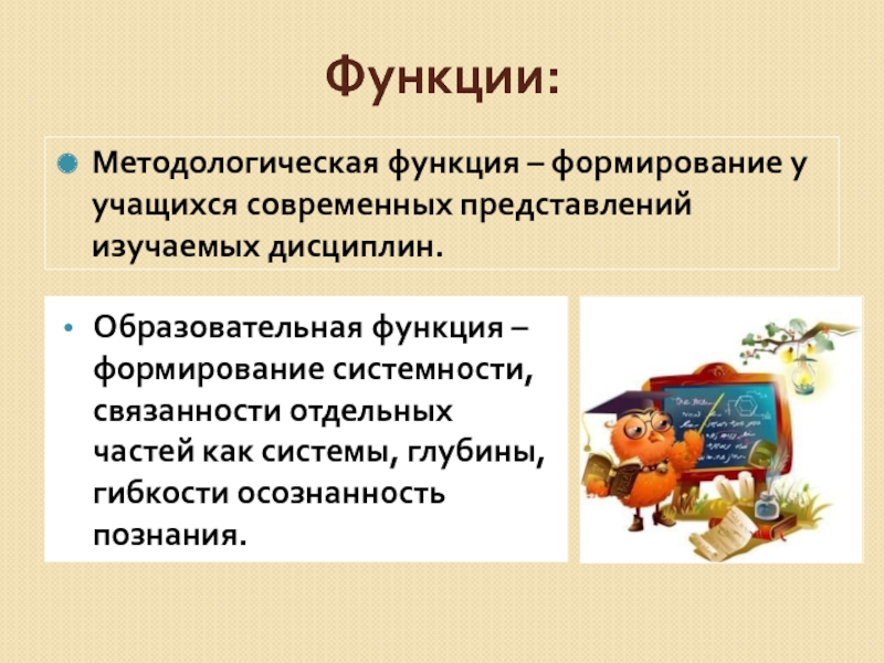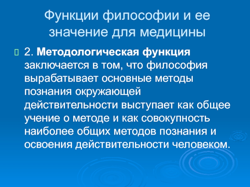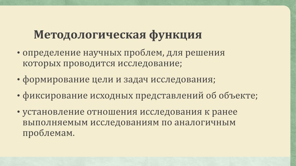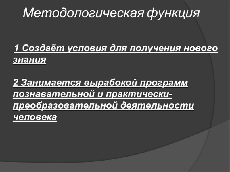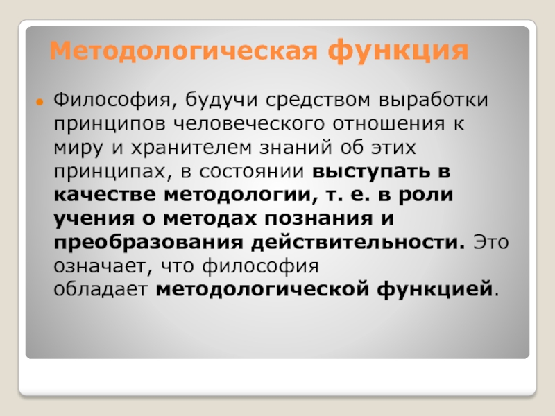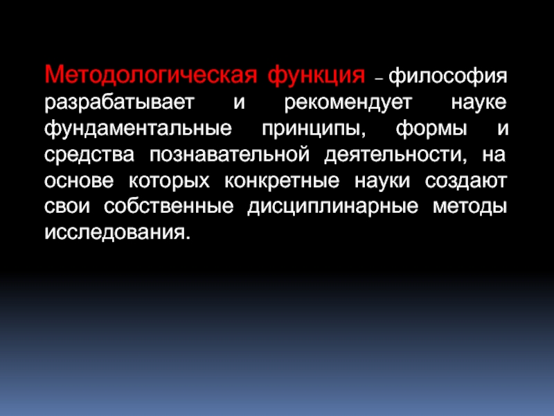 Методологическая функция философии состоит в разработке научной картины мира, обосновании образа познания и формировании обобщенной модели взаимодействия науки, общества и человека.