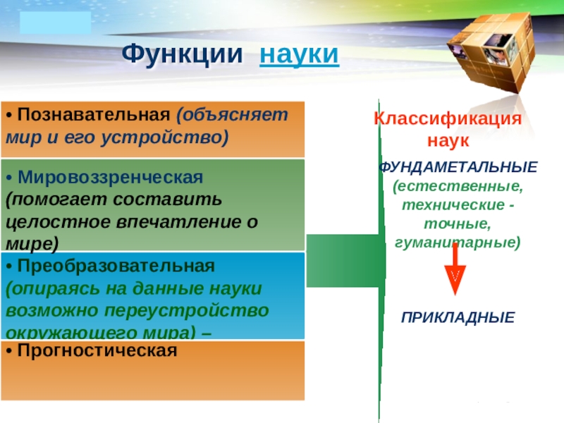 Наука: это область культуры, представляет собой специфический вид познавательной по достижению знаний, это способ познания мира, это социальный институт (такое определение только с 17 века, а остальный с сер. 1 тыс до н. э. по сей день!), совокупность объективно-истинных знаний о мире.