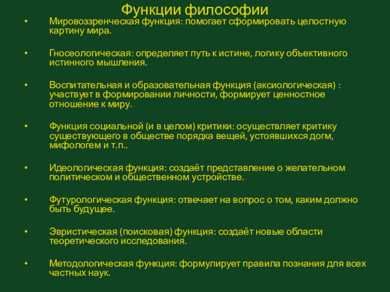 но-нравственных, этических, социальных, идеологических и др. Цель аксиологической функции — быть «ситом», через которое пропускать все нужное, ценное и полезное и отбрасывать тормозящее и отжившее. Аксиологическая функция особенно усиливается в переломные периоды истории (начало средних веков — поиск новых (теологических) ценностей после крушения Рима; эпоха Возрождения; Реформация; кризис капитализма конца XIX — начала ХХ вв.![]()