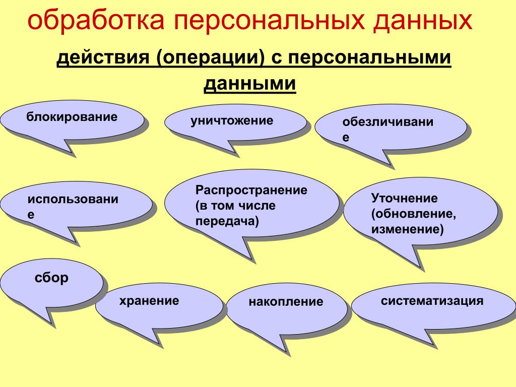 Под обработкой персональных данных подразумеваются действия по сбору, систематизации, накоплению, хранению, уточнению, использованию, передаче, обезличиванию, блокированию и уничтожению персональных данных.