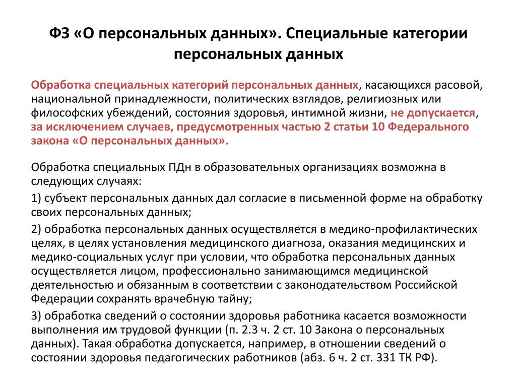 К специальной категории данных относятся сведения о национальной, расовой принадлежности, философских, политических и религиозных убеждениях, состоянии здоровья и интимной жизни. Эти данные выделяются в отдельную категорию, так как закон прямо запрещает их использовать, за исключением ряда случаев (один из них — если субъект дал письменное согласие).