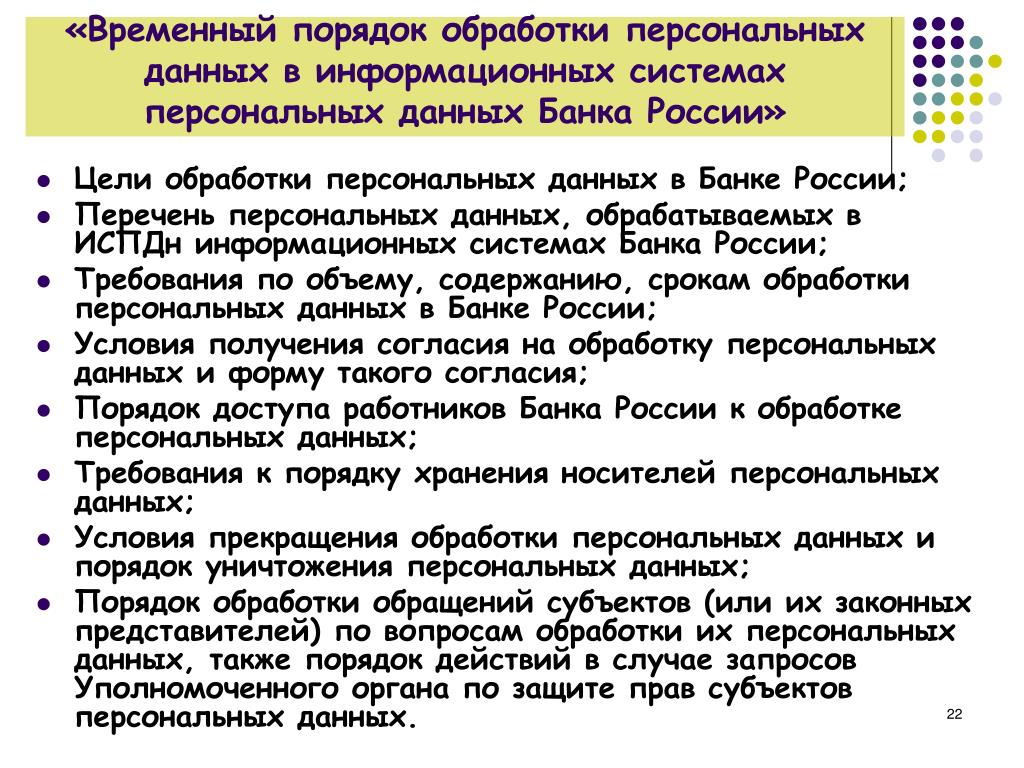 Для каждой категории субъектов (работников, клиентов, соискателей и др.) определяется цель обработки данных. Порой эта цель заключается в выполнении требований определенных законов.