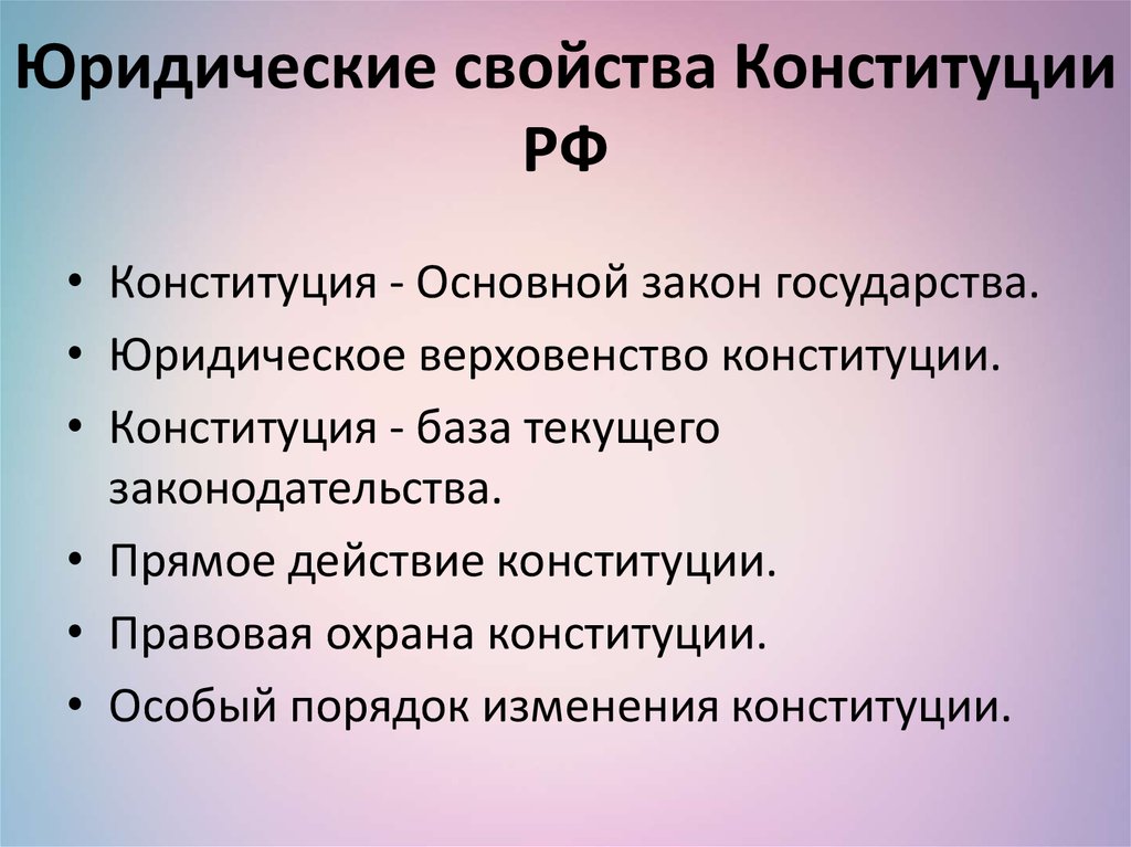 Юридические свойства Конституции помогают раскрывать ее природу, ее статусные особенности в системе права. Рассмотрим юридические признаки Конституции.