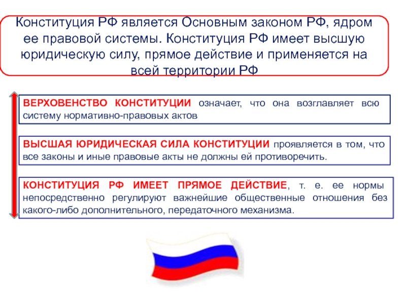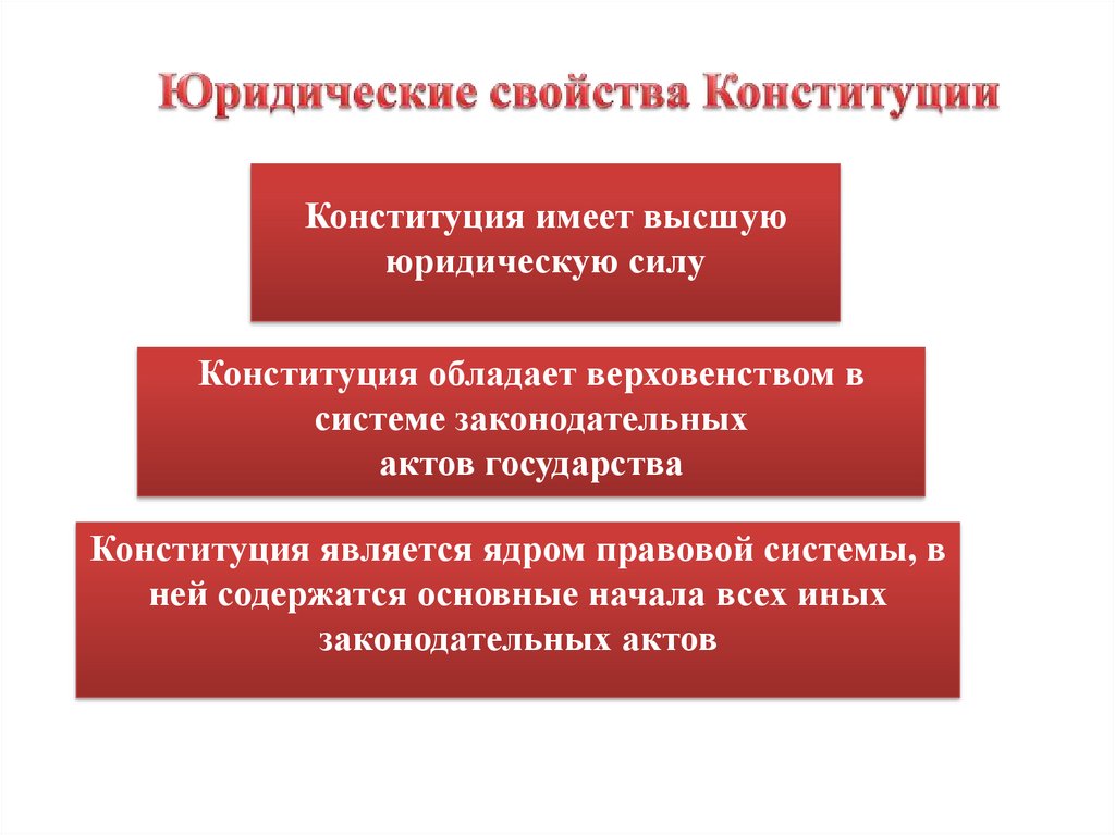 1) высшая юридическая сила. Все нормативные правовые акты на территории России не должны противоречить Конституции РФ. При этом действие Конституции РФ распространяется на всю территорию Федерации, безотносительно к тому, сколько избирателей проголосовало «за» и «против» нее на территории того или иного ее субъекта;