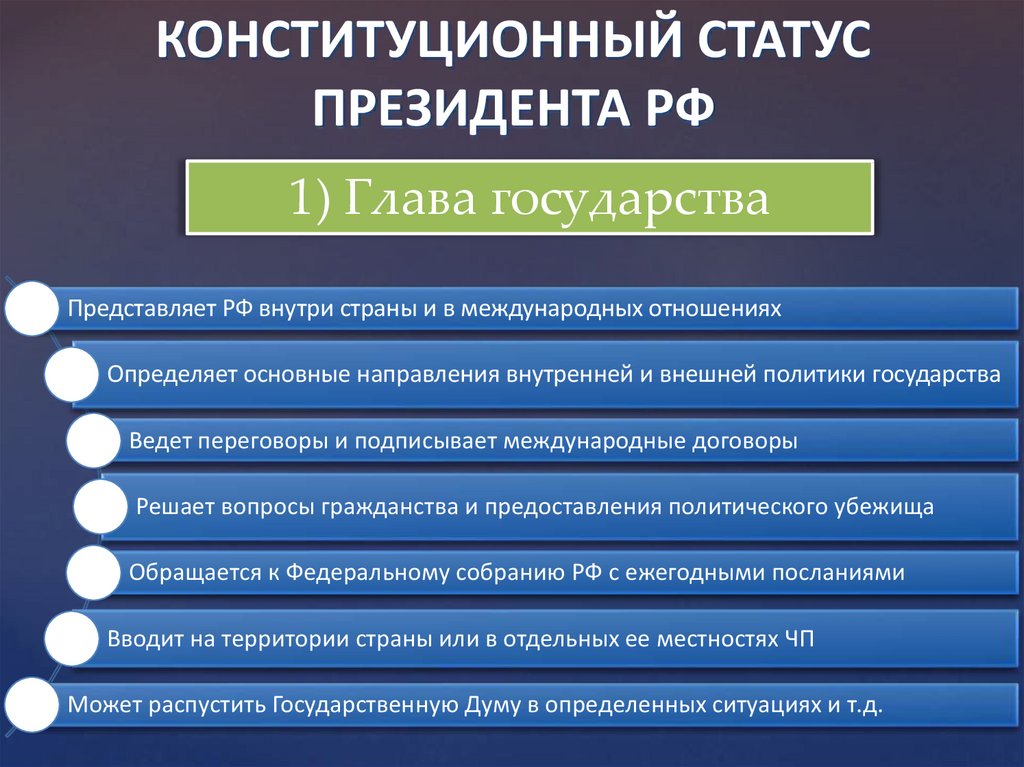 Особое место в защите Конституции РФ и конституционного строя принадлежит Президенту РФ, который как глава государства является гарантом конституции; обязанность соблюдать и защищать конституцию входит в содержание его присяги.
