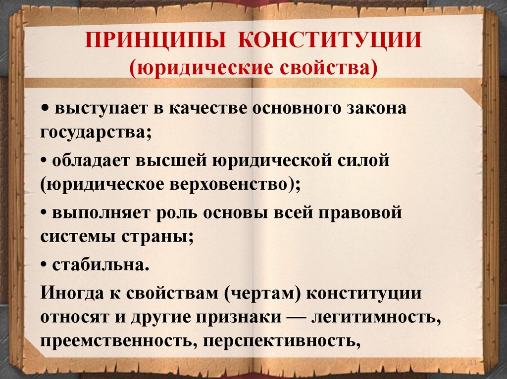 Конституция РФ как особый закон, определяющий основы правовой действительности России, обладает следующими признаками (свойствами):