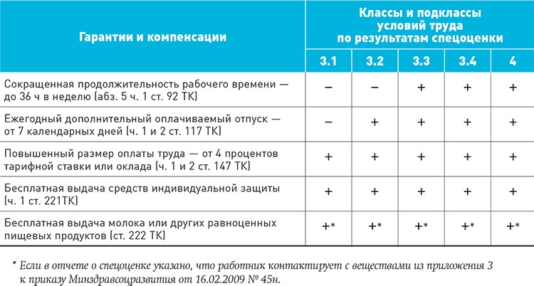 | № п/п | Класс условий труда | Виды и размер компенсаций | Основание |