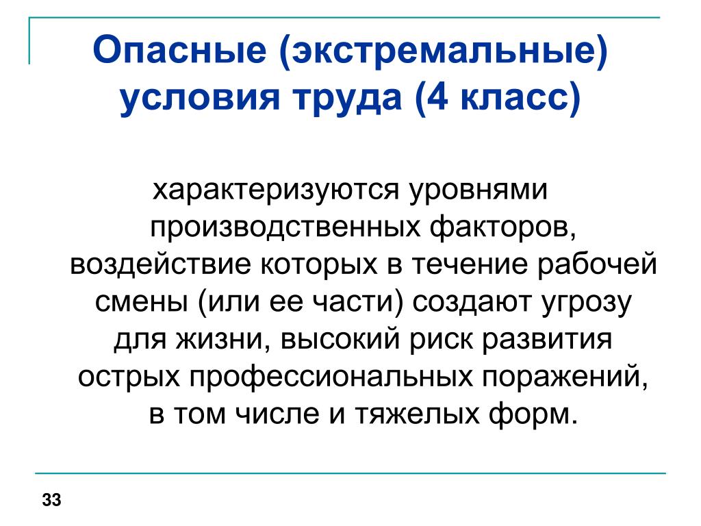 Вредные условия труда 3 класс складываются на предприятиях, где уровень воздействия отрицательных факторов превышает допустимые нормы. Ну, а четвертый устанавливается на таких рабочих местах, где вероятность угрозы жизни для сотрудника возникает ежедневно.