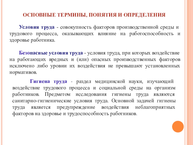 Предельно допустимая концентрация (ПДК) и предельно допустимый уровень (ПДУ) являются гигиеническими нормативами, которые определяют количество/объем производственных факторов и степень их влияния на человека – в течение всего трудового дня. ПДК и ПДУ учитываются при формировании и регулировании производственной среды. Соблюдение этих ограничений позволяет сократить риск возникновения профзаболеваний. При установке показателей, определяющих вредные условия труда, учитывается продолжительность трудового дня (8 часов) и недели (40 часов).