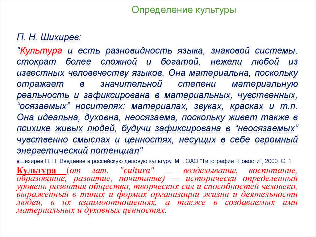 Культурология – скорее, некоторое суммарное обозначение целого комплекса разных наук, изучающих культурное поведение человека и человеческих общностей на разных этапах их исторического существования»[12]. В культурологии столько теорий, сколько крупных культурологов. И внутри каждой научно-дисциплинарной версии понимание культуры порой существенно отличается.