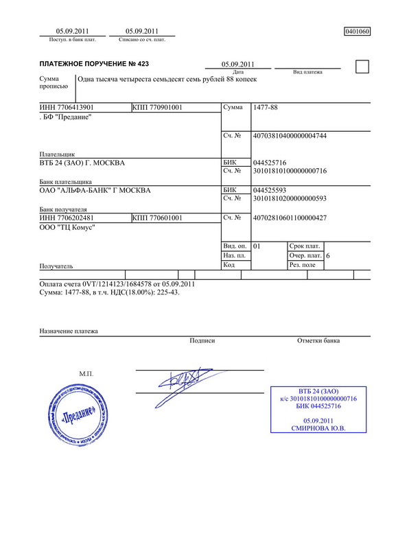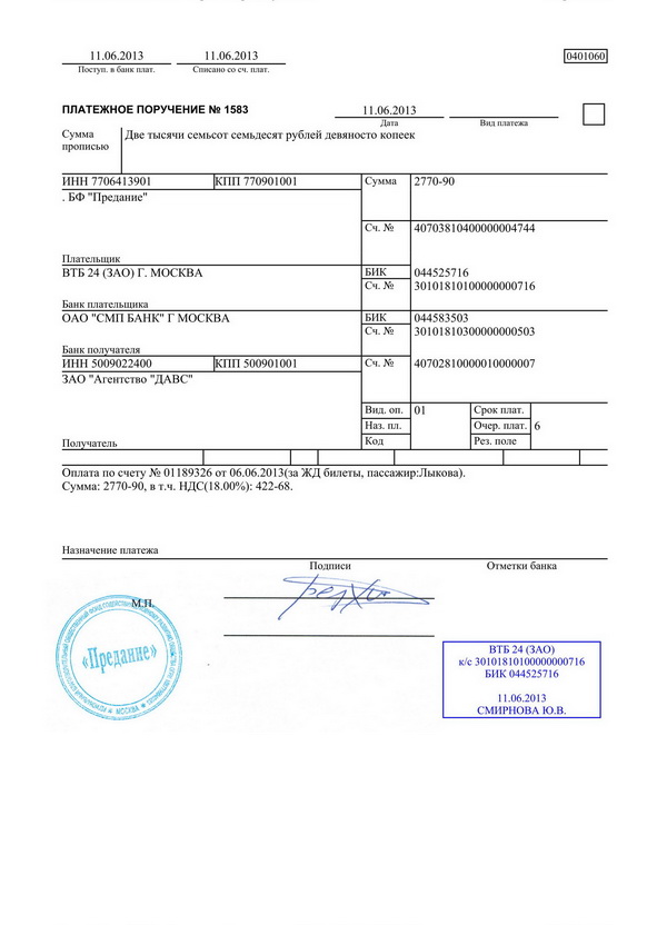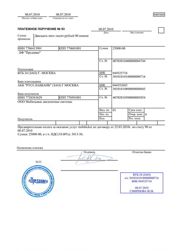 6.5. При согласии оплатить полностью или частично платежное требование — поручение плательщик оформляет его подписями лиц, уполномоченных распоряжаться счетом, и оттиском печати на всех экземплярах и сдает их в обслуживающий банк, из которых: