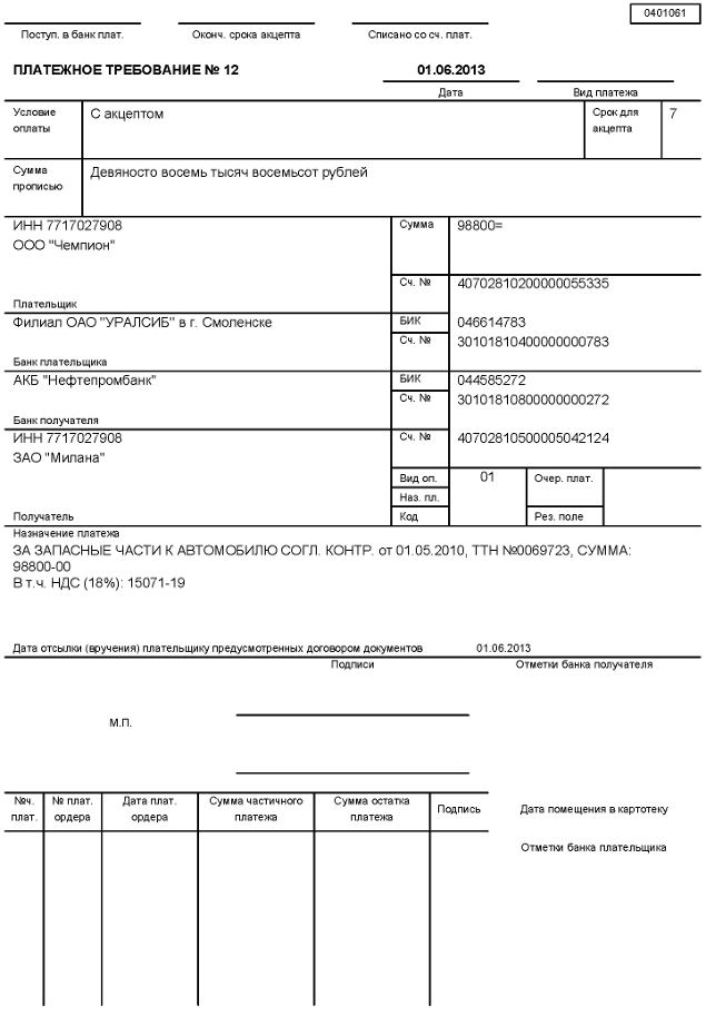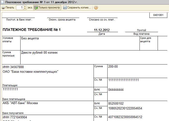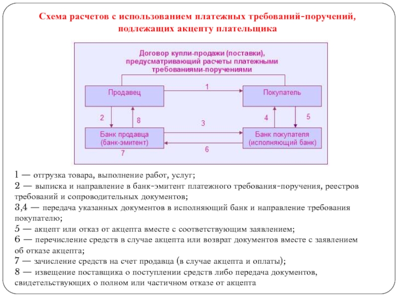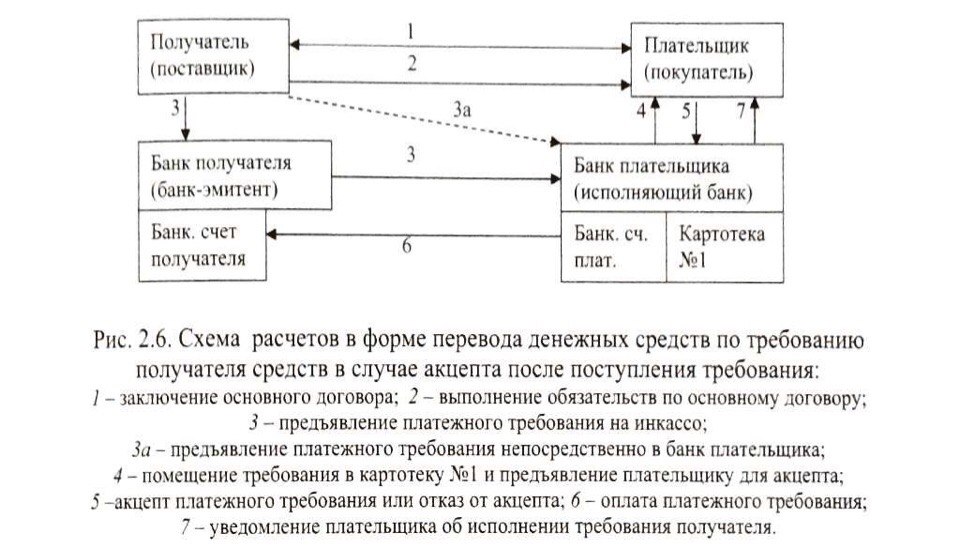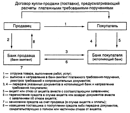 При использовании платежного требования с акцептом процедура более сложная: продавец (получатель денежных средств) должен предоставить банку требование с целым перечнем характеристик: в требовании указываются условия оплаты, срок для ответа (акцепта), дата отсылки оговоренных в договоре документов, номера и даты договора, наименования товара, номеров документов, которые подтверждают отправку товара, дату поставки товара, способ поставки и т.