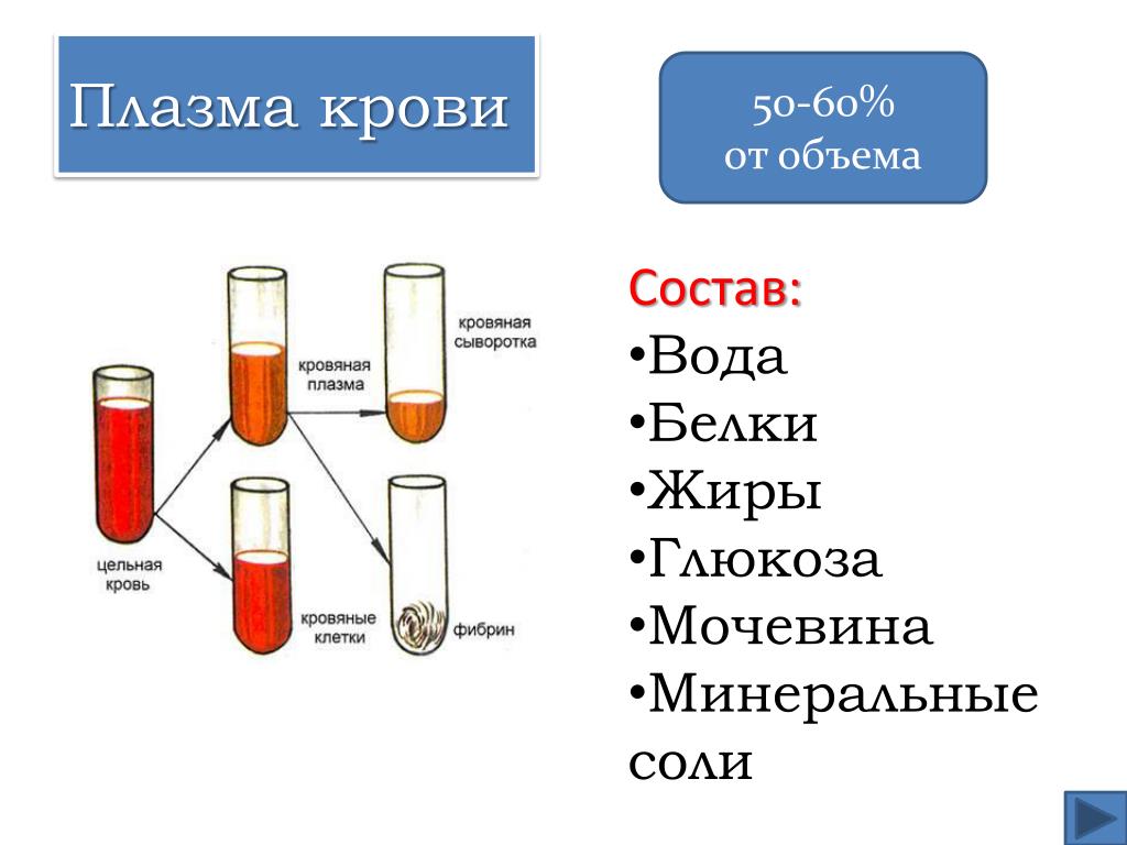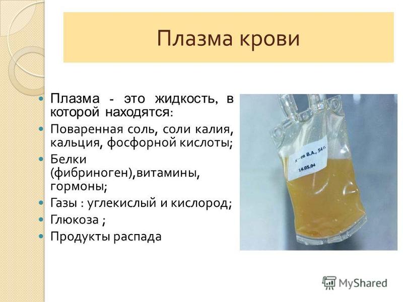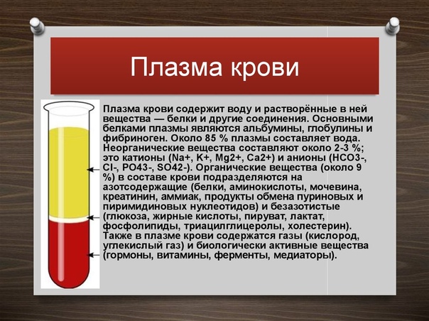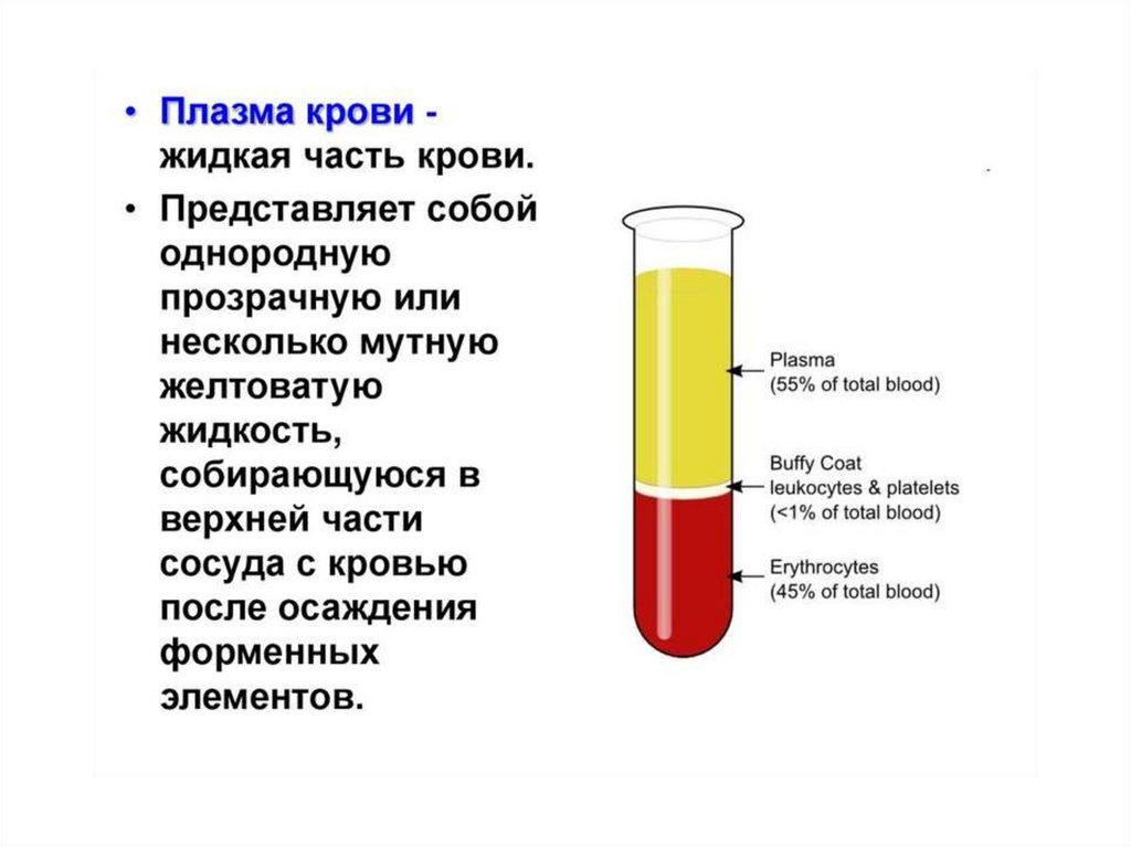 Плазма — это водная часть крови, содержащая белки и соли, в которой взвешены эритроциты, лейкоциты и тромбоциты.Он составляет примерно 55 процентов от общего объема крови. Важные элементы плазмы включают альбумин, факторы свертывания крови, фибринолитические белки, иммуноглобулины и другие белки.