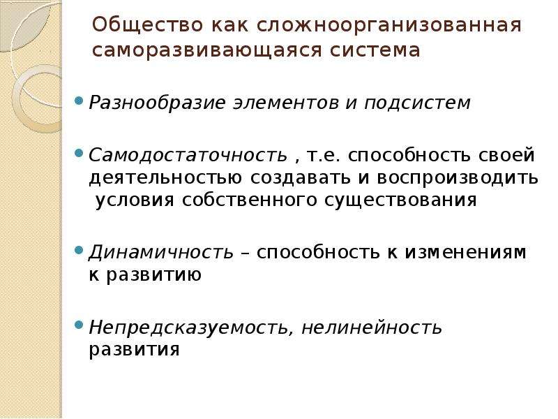 - Саморегуляция — общество само создает правила поведения, обязательные для его членов и регулирует отношения. Так возникает политический уклад страны, культура и нормы морали.