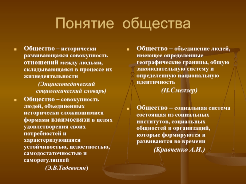 Общество — совокупность исторически сложившихся форм совместной жизни и деятельности людей. В узком смысле — это определенный вид объединения людей, общественного строя, конкретная группа.