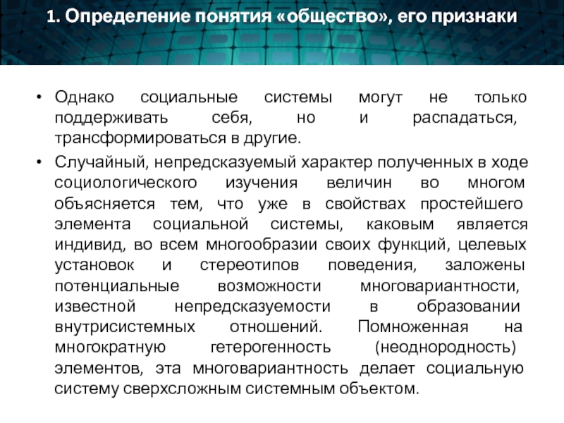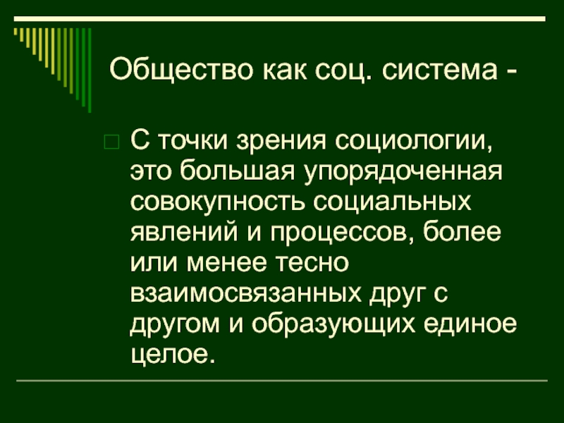 Таким образом, общество можно рассматривать, как совокупность системных социальных процессов, связанных между собой в единое целое.