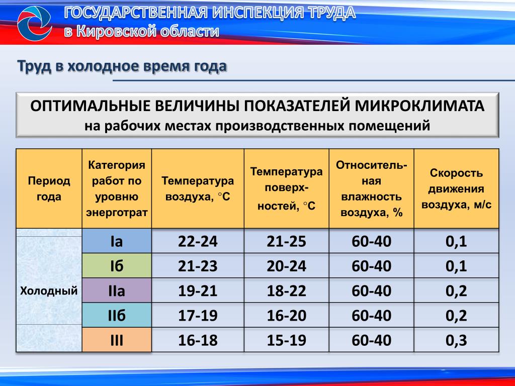 Например, если работа выполняется в холодное время года и не связана с большой энергетической тратой человеческого организма (допустим, работа оператора за компьютером), параметры микроклимата в помещении должны быть следующими: температура воздуха не менее + 22–24 °С (температура поверхностей не менее +21–25 °С, относительная влажность воздуха 60–40%, скорость движения воздуха 0,1 м/с). А если работа выполняется в теплое время года и при ее выполнении организм тратит слишком много энергии (например, работник разгружает «неподъемный» производственный инвентарь), температурная норма в помещении должна колебаться в пределах +18–20 °С (температура поверхностей не выше +17–21 °С, относительная влажность воздуха 60–40%, а скорость движения воздуха 0,3 м/с).