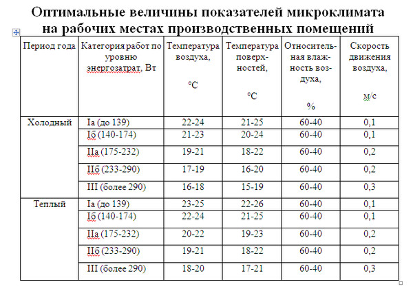 Оптимальные условия микроклимата устанавливаются по критериям оптимального теплового и функционального состояния человека и обеспечивают общее и локальное ощущение теплового комфорта в течение 8-часовой рабочей смены при минимальном напряжении механизмов терморегуляции человека, не вызывают отклонений в состоянии здоровья, создают предпосылки для высокой работоспособности.