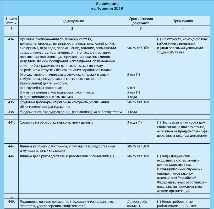 Приказы о приеме на работу, переводах и увольнении должны сохраняться в течение гораздо более длительного срока. Согласно последним изменениям, он составляет 75 лет для тех приказов, что были изданы до 2003 г. и 50 лет для тех, что были созданы позднее. Хранятся такие документы в самой организации, а при ее ликвидации передаются в государственный или муниципальный архив, где и находятся весь предусмотренный распоряжением Минкультуры срок.