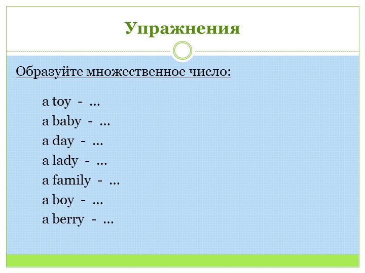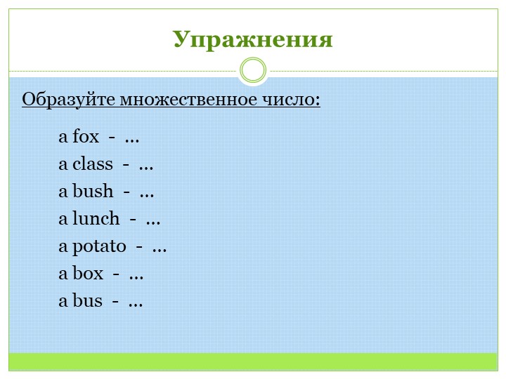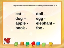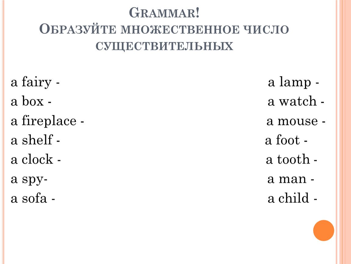 4. Вспомним существительные-исключения man — men, woman — women, foot — feet, tooth — teeth, louse, lice, mouse — mice, child — children, goose — geese, sheep — sheep, deer — deer, fish — fish, trout — trout, ox — oxen, swine — swine, salmon — salmon, spacecraft — spacecraft, means — means, species — species, series — series, etc.