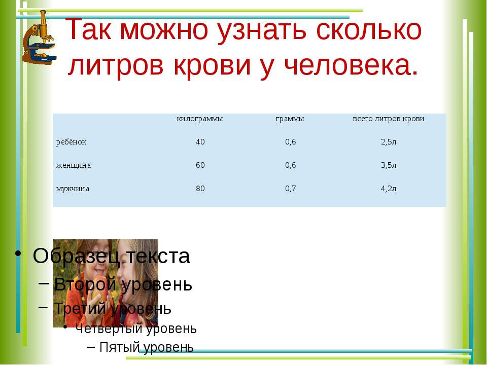 «Π’ΠΎ, ΡΠΊΠΎΠ»ΡΠΊΠΎ ΠΊΡΠΎΠ²ΠΈ Π² ΠΎΡΠ³Π°Π½ΠΈΠ·ΠΌΠ΅ ΡΠ΅Π»ΠΎΠ²Π΅ΠΊΠ° ΡΠΎΠ΄Π΅ΡΠΆΠΈΡΡΡ, Π½Π°ΠΏΡΡΠΌΡΡ Π·Π°Π²ΠΈΡΠΈΡ ΠΎΡ ΠΌΠ°ΡΡΡ ΡΠ΅Π»Π°. ΠΡΠ»ΠΈ ΠΎΠ½Π° ΡΠΎΡΡΠ°Π²Π»ΡΠ΅Ρ 50 ΠΊΠ³, ΡΠΎ Π² ΡΡΠ΅Π΄Π½Π΅ΠΌ Π½Π°ΡΡΠΈΡΡΠ²Π°Π΅ΡΡΡ 3-4 Π»ΠΈΡΡΠ°. ΠΡΠΈ Π²Π΅ΡΠ΅ Π² 60 ΠΊΠ³ Ρ Π²Π·ΡΠΎΡΠ»ΠΎΠ³ΠΎ ΡΠ΅Π»ΠΎΠ²Π΅ΠΊΠ° ΠΌΠΎΠΆΠ΅Ρ Π±ΡΡΡ 3,6-4,8 Π». ΠΡΠ»ΠΈ ΡΠ΅Π»ΠΎΠ²Π΅ΠΊ Π²Π΅ΡΠΈΡ 80 ΠΊΠ³, ΡΠΎ ΠΏΠΎΠΊΠ°Π·Π°ΡΠ΅Π»Ρ ΡΠΎΡΡΠ°Π²Π»ΡΠ΅Ρ 4,8-6,4. ΠΡΠΈ Π²Π΅ΡΠ΅ 70 ΠΊΠ³ Π½Π°ΡΡΠΈΡΡΠ²Π°Π΅ΡΡΡ 4,3 β 6,4. ΠΡΠΈ Π²Π΅ΡΠ΅ 90 ΠΊΠΈΠ»ΠΎΠ³ΡΠ°ΠΌΠΌΠΎΠ² ΠΏΠΎΠΊΠ°Π·Π°ΡΠ΅Π»Ρ ΡΠΎΡΡΠ°Π²ΠΈΡ 5,6-7,2 Π»ΠΈΡΡΠ°. ΠΡΠΈ Π²Π΅ΡΠ΅ 100 ΠΊΠΈΠ»ΠΎΠ³ΡΠ°ΠΌΠΌ Π±ΡΠ΄Π΅Ρ Π½Π°ΡΡΠΈΡΡΠ²Π°ΡΡΡΡ 6-8 Π»ΠΈΡΡΠΎΠ².
