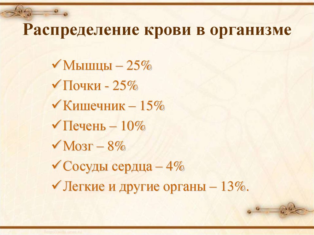 ΠΠΎΠ»Π΅Π΅ ΡΠΎΠ³ΠΎ, ΠΊΡΠΎΠ²Ρ Π½Π΅ΡΠ°Π²Π½ΠΎΠΌΠ΅ΡΠ½ΠΎ ΡΠ°ΡΠΏΡΠ΅Π΄Π΅Π»Π΅Π½Π° Π² ΠΎΡΠ³Π°Π½ΠΈΠ·ΠΌΠ΅. Π’Π°ΠΊ, 50% Π΅Π΅ ΠΎΠ±ΡΠ΅ΠΌΠ° ΠΏΡΠΈΡ ΠΎΠ΄ΡΡΡΡ Π½Π° ΠΌΡΡΡΡ ΠΈ ΠΏΠΎΡΠΊΠΈ, 13% β Π½Π° Π»Π΅Π³ΠΊΠΈΠ΅, 10% β Π½Π° ΠΏΠ΅ΡΠ΅Π½Ρ, 8% β Π½Π° ΠΌΠΎΠ·Π³, ΠΎΡΡΠ°Π»ΡΠ½ΡΠ΅ β Π½Π° ΡΠ΅ΡΠ΄Π΅ΡΠ½ΡΠ΅ ΡΠΎΡΡΠ΄Ρ ΠΈ ΡΠΎΡΡΠ΄Ρ ΠΊΠΈΡΠ΅ΡΠ½ΠΈΠΊΠ°.