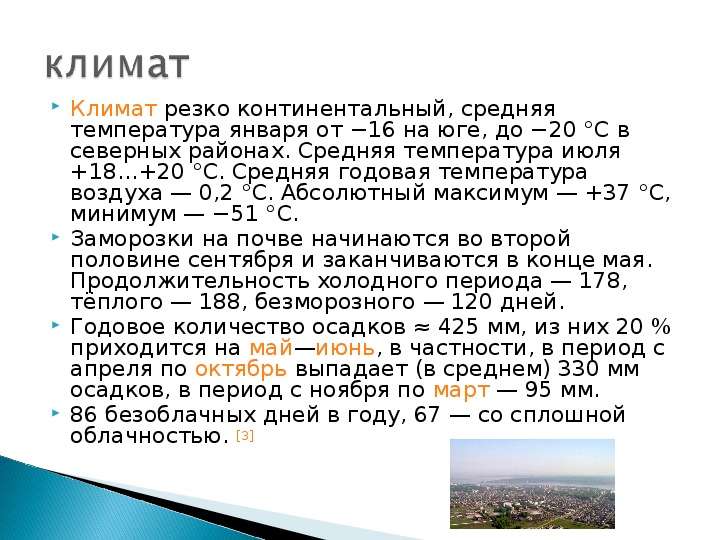 Средние температуры января – от -28° до -48°, то есть ниже, чем на островах Северного Ледовитого океана в арктическом климатическом поясе. Лето достаточно теплое, средние температуры июля от +16° до +20°, но непродолжительное.