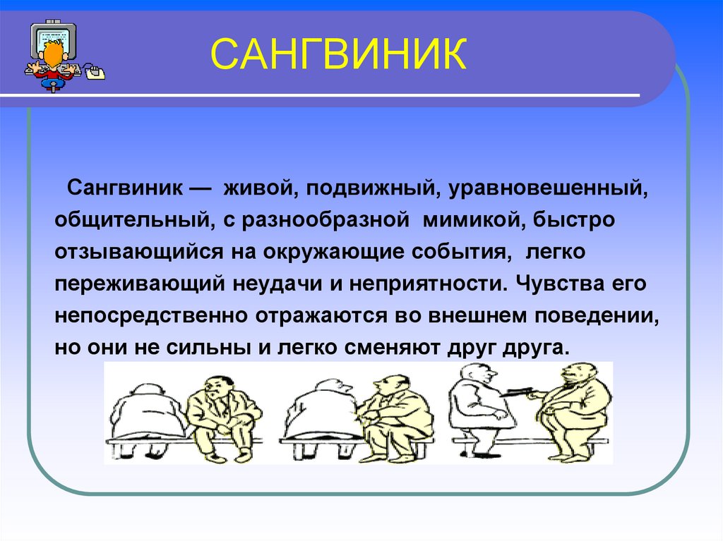 - Сангвиник — тип темперамента, соответствующий крови в организме. Эти люди — беззаботные искатели удовольствий.
