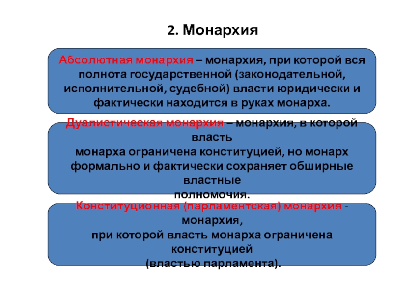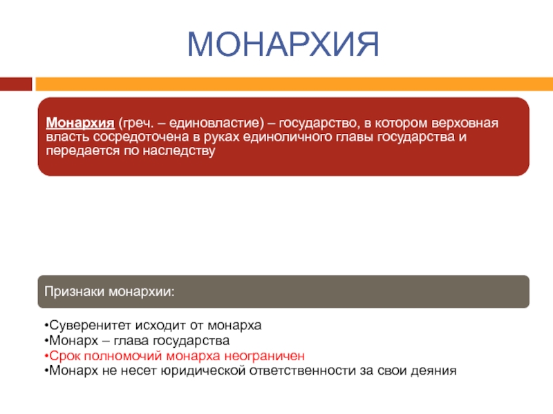 ( монархий )- Правительство, в котором суверенитет воплощается в руках одного, сегодня обычно наследственного главы государства (будь то номинальный глава или могущественный правитель).
