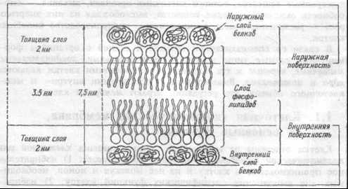 Клеточная мембрана это плотные пленки из белков и липидов (в основном, фосфолипидов). Молекулы липидов расположены упорядоченно — перпендикулярно к поверхности, в два слоя, так, что их части, интенсивно взаимодействующие с водой (гидрофильные), направлены наружу, а части, инертные к воде (гидрофобные) — внутрь.