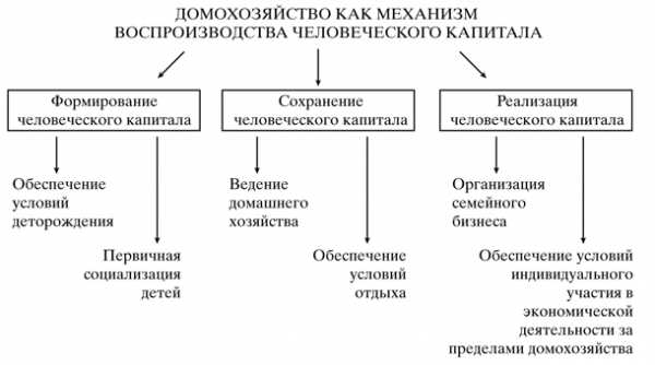 Определяющей для домохозяйства является функция воспроизводства (восполнения затрат и накопления) человеческого капитала. Понятием «человеческий капитал» обозначают совокупность неотрывных от человека знаний, навыков, опыта, реализуя которые индивид создает материальные условия для себя и своих близких.