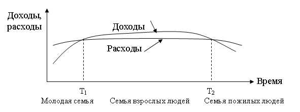 Очевидно, что в бюджете домохозяйства, как правило, доходы определяют расходы. Но при этом далеко не всегда осуществляется полное и систематичное сбалансирование бюджета. Исследования показали, что домохозяйства при определении потребления часто ориентируются не на текущие доходы, а на желаемый уровень потребления и жизненные стандарты. В зависимости от фазы жизненного цикла домохозяйства может существовать устойчивая положительная либо отрицательная разница между текущими доходами и расходами. Так, молодые семьи могут в течение долгого времени жить в долг, а взрослые люди постоянно делают сбережения, чтобы использовать их в старости (рис. 3).