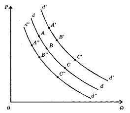 Для этого в тех же осях цен и количества товаров поместим уже известную нам кривую спроса dd. Неценовые факторы вызывают изменения спроса на товары, независимо от уровня их цены. Изменение неценовых факторов вызывает смещение всей кривой спроса, показывая изменение количества спрашиваемых товаров по той же цене.