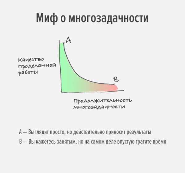 Отдельно хотелось бы выделить так называемую способность мультитаск — выполнение нескольких дел одновременно. Новая концепция эффективности, которая ещё чуть ли не превозносится до небес и считается одной из характеристик эффективной работы, в действительности ведёт к противоположному — к дезорганизации, расфокусировке внимания, увеличению стресса и падению качества выполнения задания.