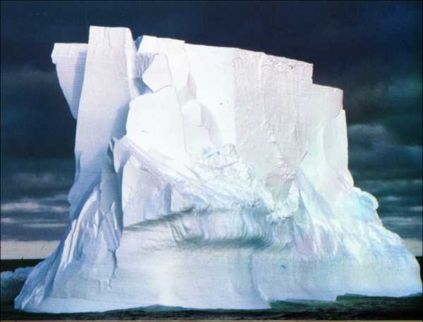 Различают ледники материковые, или покровные, и горные. Материковые льды занимают огромные площади в Антарктиде, Гренландии, на многих полярных островах. Толщина льда материковых ледников неодинакова. Например, в Антарктиде она достигает 4000 м. Под действием громадной тяжести лед сползает в море, обламывается, и образуются айсберги — ледяные плавучие горы.