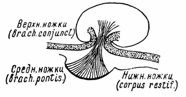 Анатомически и физиологически мозжечок связывается с прочими отделами нервной системы множеством связей, среди которых различают афферентные и эфферентные волокна. Последние проходят через верхние ножки структуры. Как видно, средние ножки связывают мозжечок и некоторые участки непосредственно коры головного мозга.