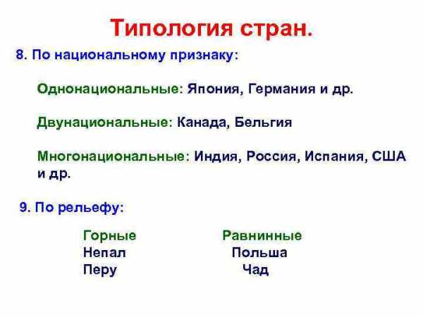 Описание слайда:Типология стран. 8. По национальному признаку:Однонациональные: Япония, Германия и др.Двунациональные: Канада, БельгияМногонациональные: Индия, Россия, Испания, США и др.9. По рельефу:Горные РавнинныеНепал ПольшаПеру Чад