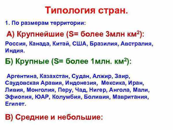 Типология стран. 1. По размерам территории: А) Крупнейшие (S= более 3 млн км 2): Россия, Канада, Китай, США, Бразилия, Австралия, Индия. Б) Крупные (S= более 1 млн. км 2): Аргентина, Казахстан, Судан, Алжир, Заир, Саудовская Аравия, Индонезия, Мексика, Иран, Ливия, Монголия, Перу, Чад, Нигер, Ангола, Мали, Эфиопия, ЮАР, Колумбия, Боливия, Мавритания, Египет. В) Средние и небольшие: